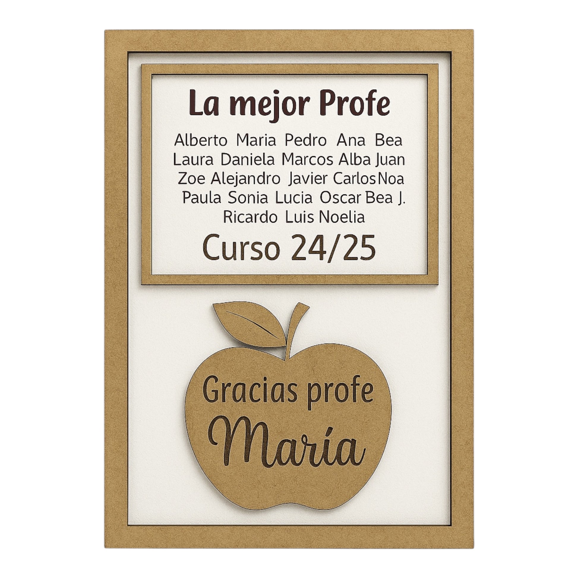 Está diseñado con cariño en nuestro taller, con los nombres de todos los peques y el nombre de la profe grabados con láser. Ideal para regalar en grupo al finalizar el curso escolar.