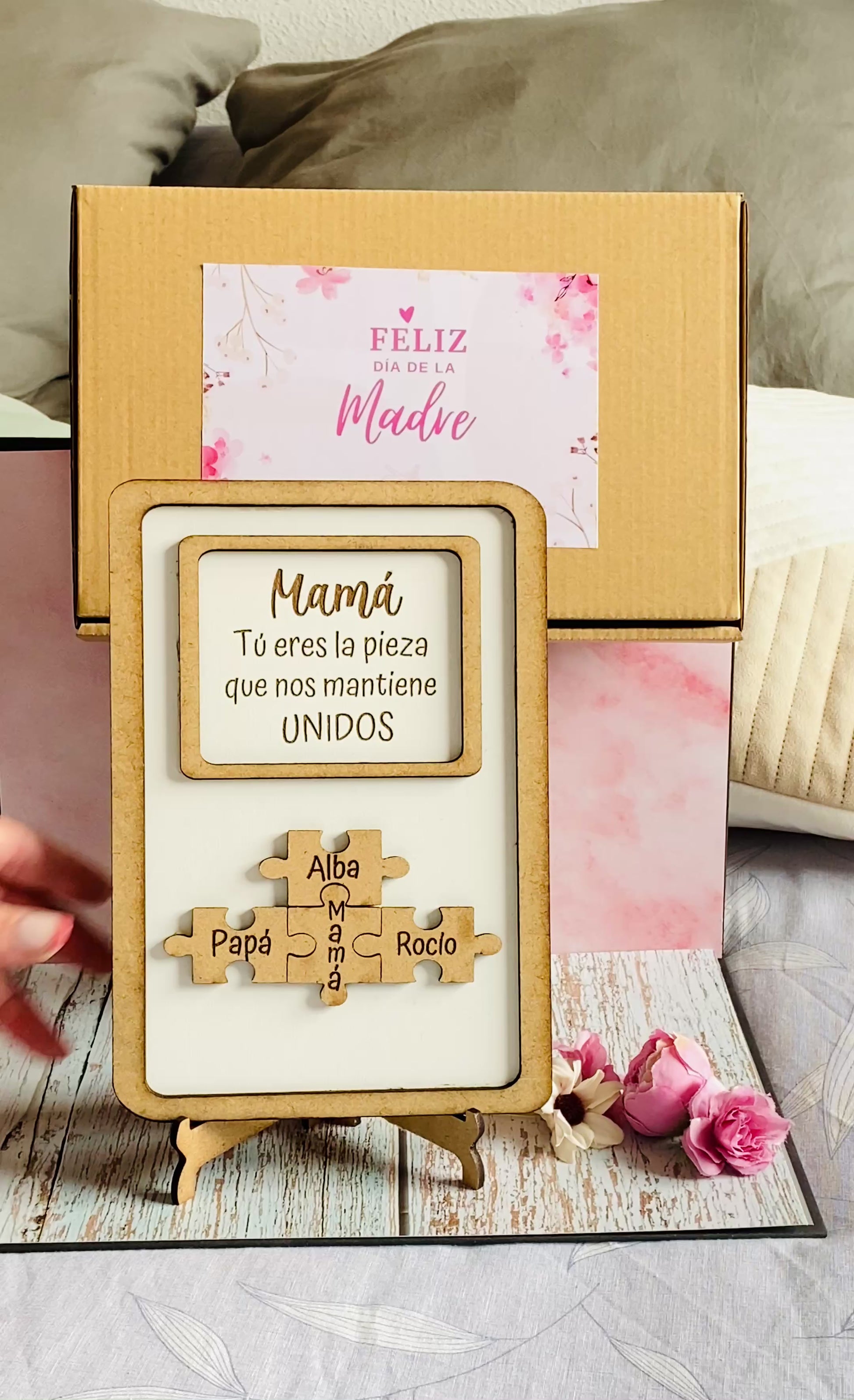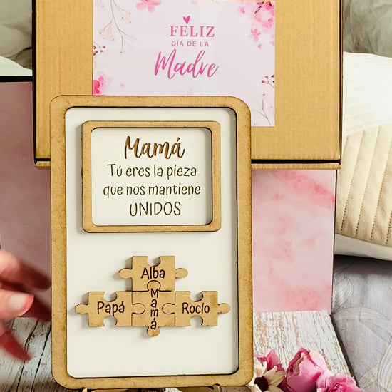 Cuadro decorativo Mamá, Papá, abuela, abuelo, tu eres la pieza que nos une con nombres personalizados en piezas de puzzle.