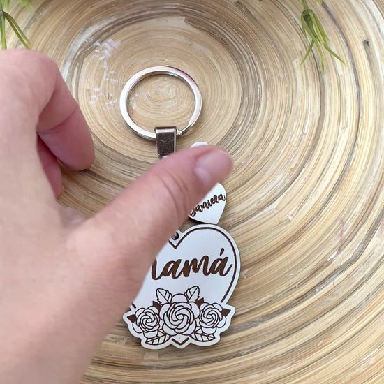 Celebra el amor más grande con este llavero personalizado para mamá, diseñado para emocionar y conservar para siempre los nombres de sus hijos grabados en pequeños corazones de madera.