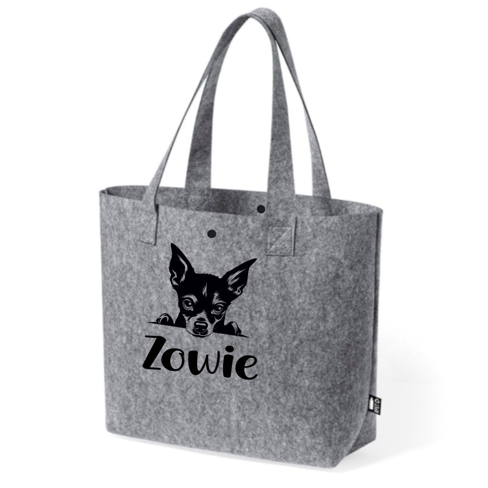 - 👜 Bolso Personalizado: Diseño único con la ilustración de tu mascota y su nombre, fabricado en fieltro reciclado.