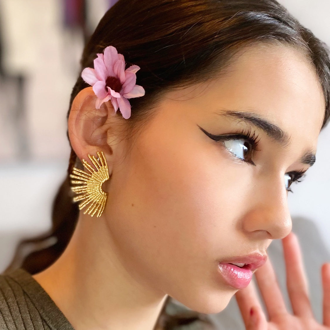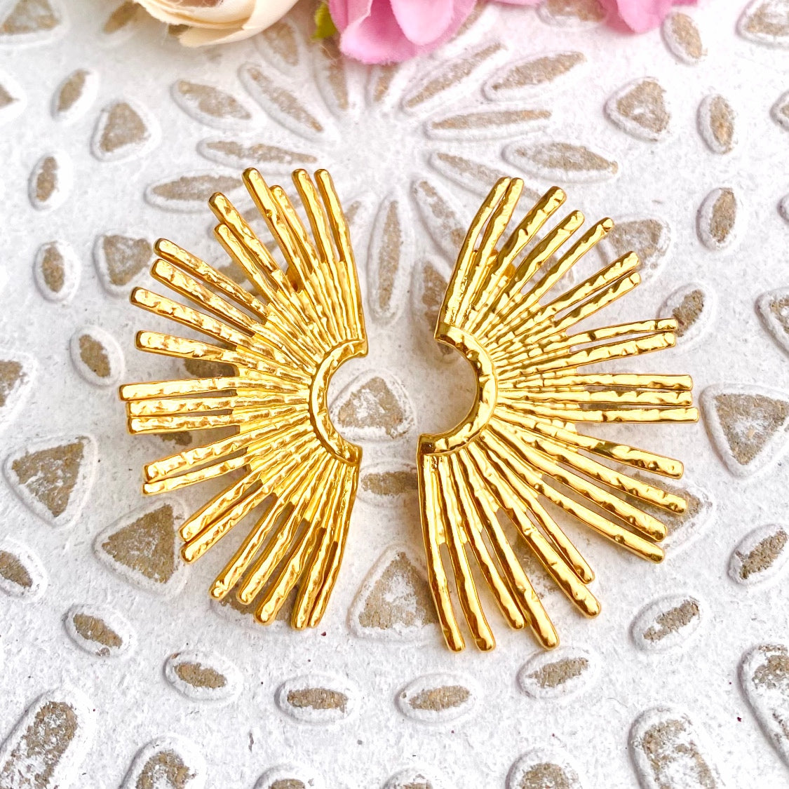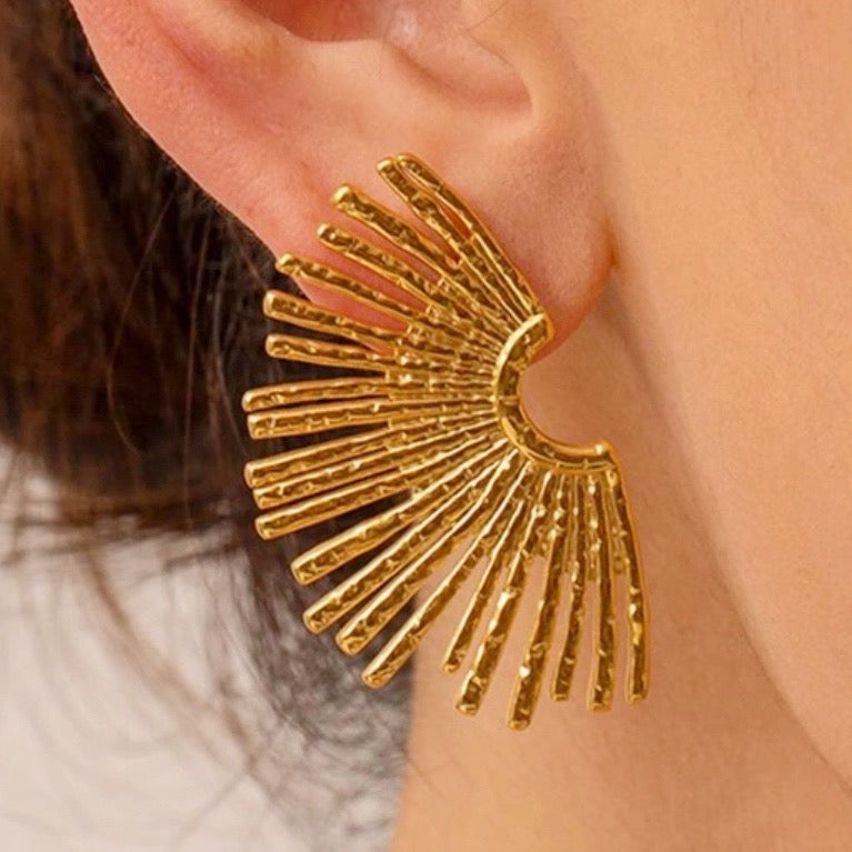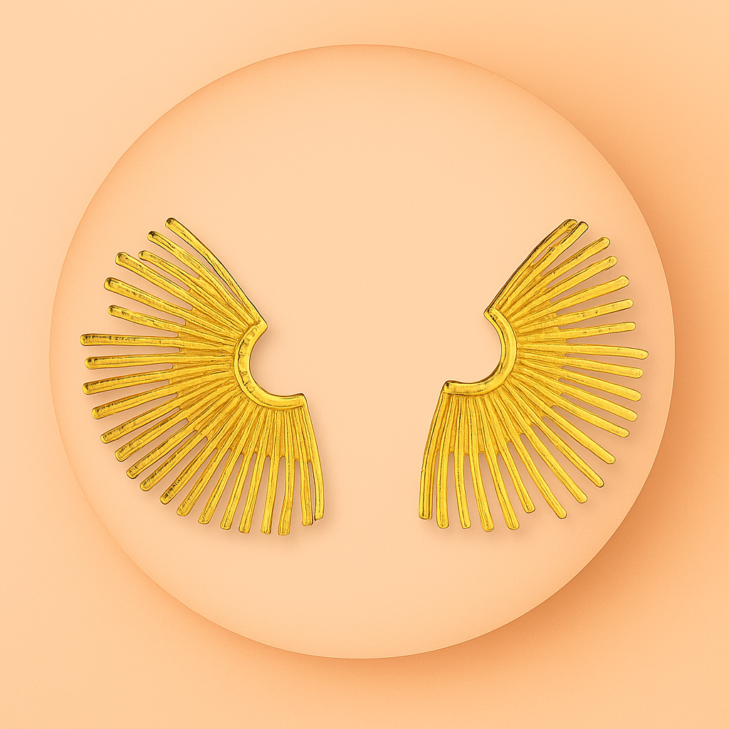 Los Pendientes Luz del Alba capturan la magia de los primeros rayos del sol con su diseño en forma de medio sol y abanico. Su acabado en oro de 18kt refleja la luz con un brillo espectacular, convirtiéndose en la pieza ideal para quienes buscan destacar con elegancia y personalidad.